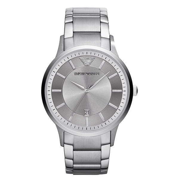 Elevate your everyday style with this sophisticated Emporio Armani men’s analog watch. Featuring a sleek 43mm stainless steel case and a matching silver stainless steel bracelet, this timepiece offers a timeless and polished look. The silver dial complements the design, creating a cohesive and elegant aesthetic. Driven by a precise quartz movement, this watch ensures accurate timekeeping. Its classic 3-hand configuration provides clear and easy-to-read functionality. Water-resistant to [Insert Water Resistance Depth ‚Äì information missing from source data], this watch is suitable for everyday wear. This Emporio Armani watch is a perfect blend of quality craftsmanship and refined design, making it an ideal accessory for the discerning gentleman.