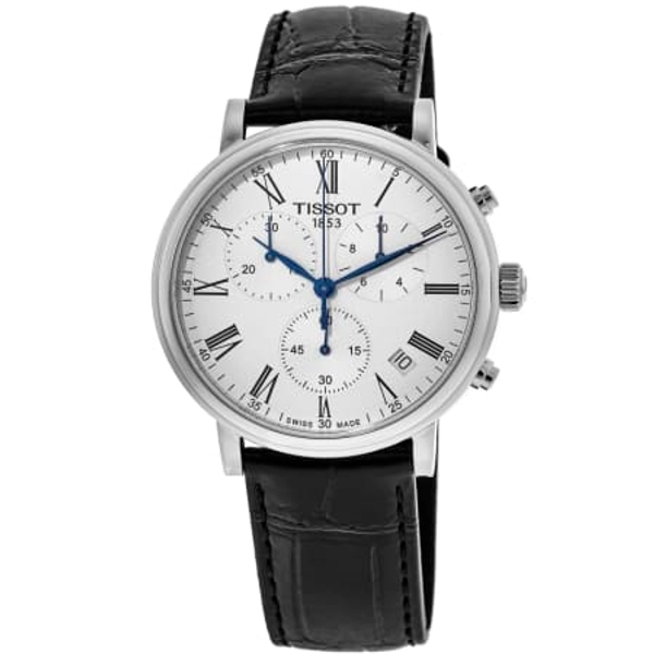 Dial: Silver with blue hands, Roman numeral markers, and three chronograph sub-dials