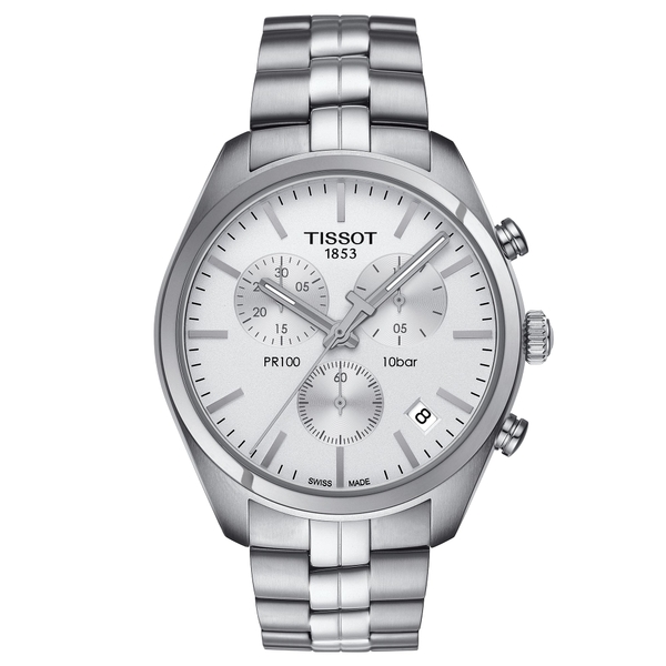 The Tissot PR 100 Chronograph Men’s Silver Watch (T101.417.11.031.00) embodies precision and robustness, living up to its name as a flagship model in the Tissot collection. This timepiece seamlessly blends classic watchmaking with contemporary aesthetics. The crisp white dial features chronograph sub-dials providing precise timekeeping functionality, while the silver stainless steel case and bracelet offer a polished and refined look. Built with a reliable Swiss quartz movement, this watch is designed for everyday wear and special occasions. Upgrade your style with this timeless yet modern Tissot PR 100.